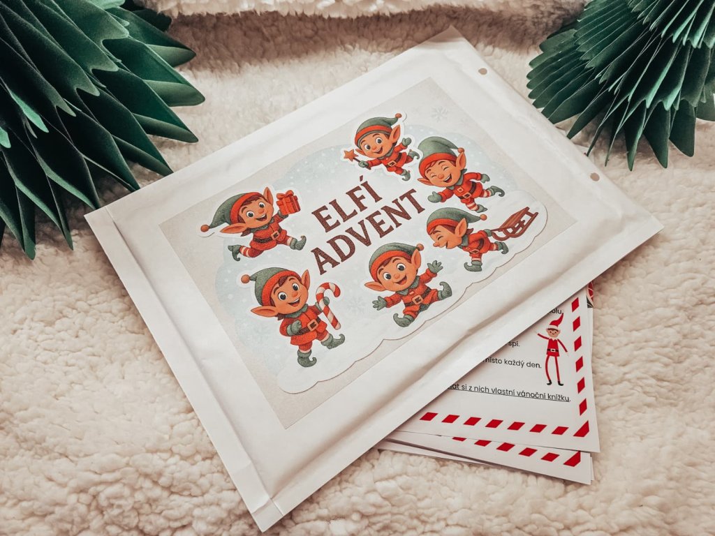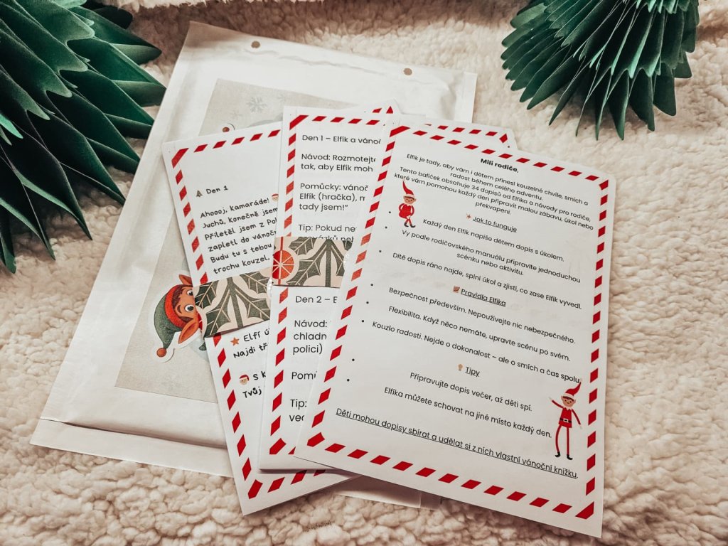 K tomu navyše dostanete listy od Elfíka na každý deň – každý list obsahuje krátky odkaz od Elfíka a jednoduchú úlohu pre deti, ktorá rozvíja fantáziu, radosť a vianočnú atmosféru.