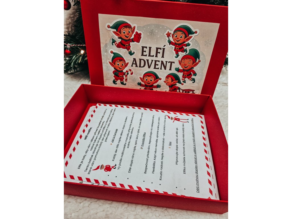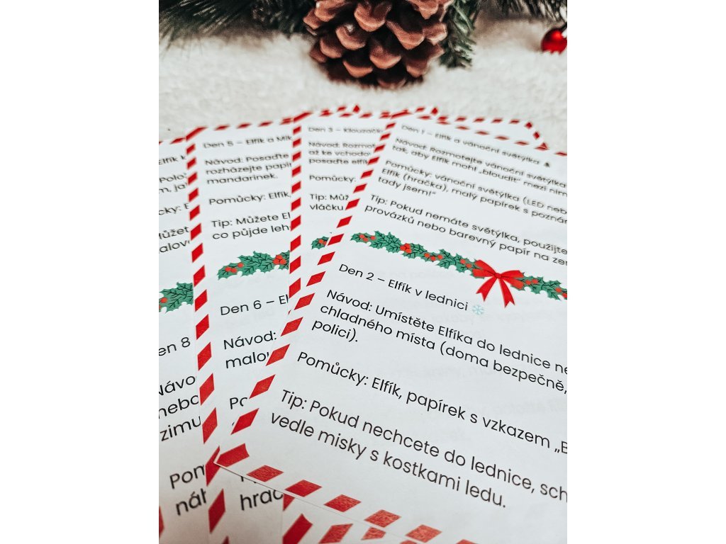 K tomu navyše dostanete listy od Elfíka na každý deň – každý list obsahuje krátky odkaz od Elfíka a jednoduchú úlohu pre deti, ktorá rozvíja fantáziu, radosť a vianočnú atmosféru.